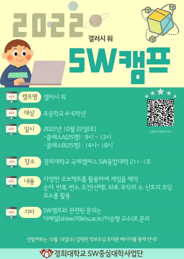 SW캠프와 관련된 문의 사항은 이메일(shlee7@khu.ac.kr/이승형 교수)로 하시면 됩니다.