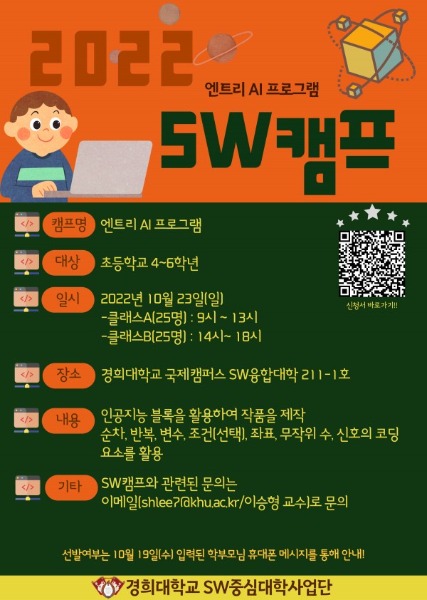 SW캠프와 관련된 문의 사항은 이메일(shlee7@khu.ac.kr/이승형 교수)로 하시면 됩니다.