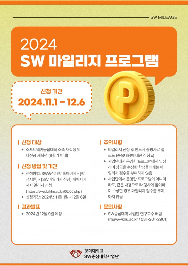 1)신청방법 : SW중심대학 홈페이지 - [학생지원] - [SW마일리지 신청] 페이지에서 마일리지 신청 ( https://swedu.khu.ac.kr/06/05.php )