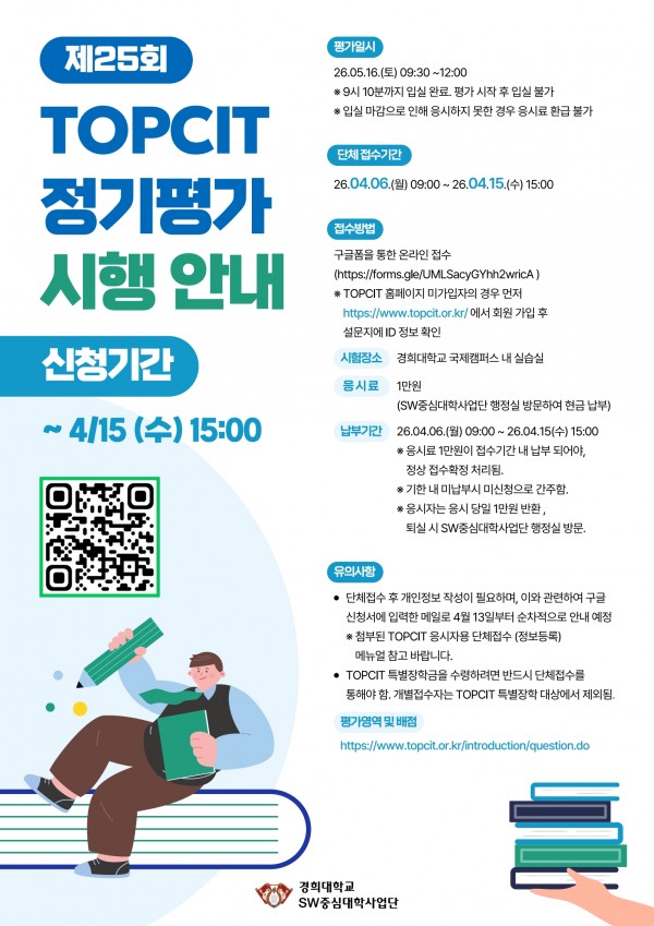 TOPCIT 제25회 정기평가 시행 안내 (신청기한: 4/15(수) 15:00까지)