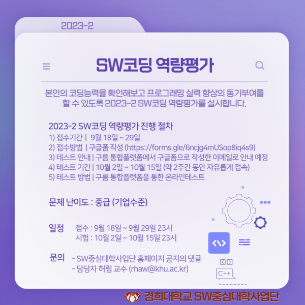 2023년도 2학기 경희대학교 소프트웨어융합대학 학생을 대상으로 본인의 코딩 능력을 확인해보고 프로그래밍 실력 향상의 동기부여를 할 수 있도록 경희대 SW중심대학 사업단에서 2023-2 SW코딩 역량평가를 실시합니다.