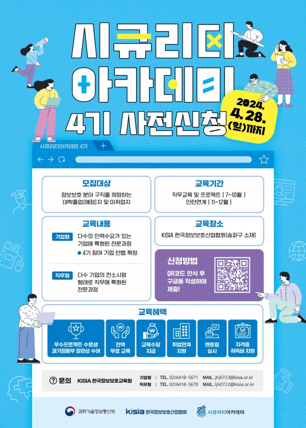 안녕하세요. 아래와 같이 [KISIA] 시큐리티아카데미 4기 사전신청 홍보요청을 받아 안내드리오니, 참고 바랍니다.