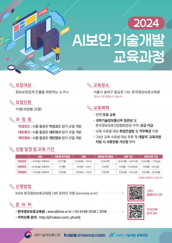[홍보] [KISIA] 2024 AI보안 기술개발 교육과정 교육생 모집