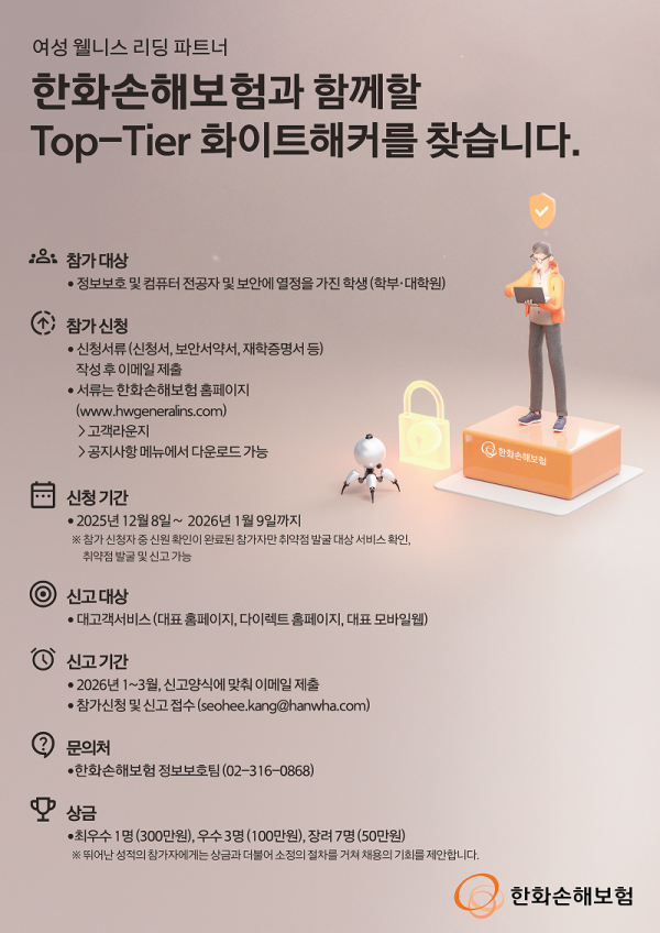 [홍보] [한화손해보험] 버그바운티(Top-Tier 화이트해커를 찾습니다) 개최 (신청기간: ~1/9)