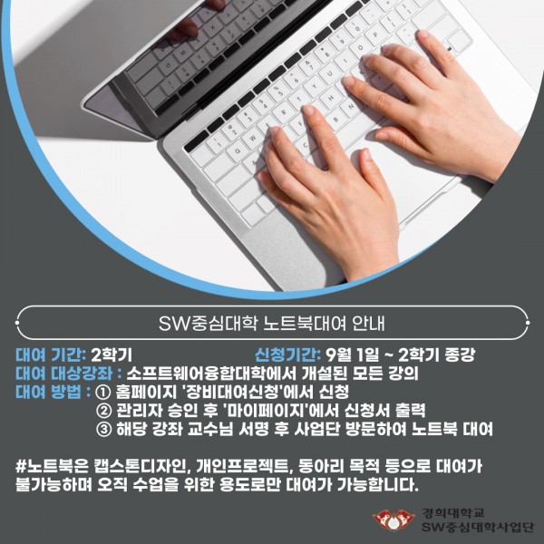 2021년 2학기 노트북 대여 안내 페이지 정보 작성자 SW중심대학 댓글 0건 조회 1,300회 작성일 21-09-01 13:20 본문 #INFO21 아이디로 로그인 하셔야 정상적인 이용이 가능합니다 목록 이전글제 18회 KHU 가을 프로그래밍 경시대회[9월 24일까지 기간연장] 21.09.01 다음글제 16회 TOPCIT정기평가 신청안내(경희대 단체접수 국문) 21.09.01 댓글목록 댓글목록 등록된 댓글이 없습니다.