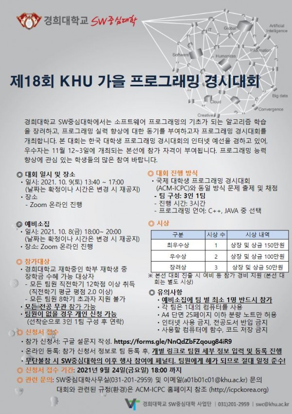 제 18회 KHU 가을 프로그래밍 경시대회[9월 24일까지 기간연장] 페이지 정보 작성자 SW중심대학 댓글 0건 조회 3,118회 작성일 21-09-01 14:53 본문 목록 이전글2021-2학기 SW수업도우미 모집 21.09.07 다음글2021년 2학기 노트북 대여 안내 21.09.01 댓글목록 댓글목록 등록된 댓글이 없습니다.