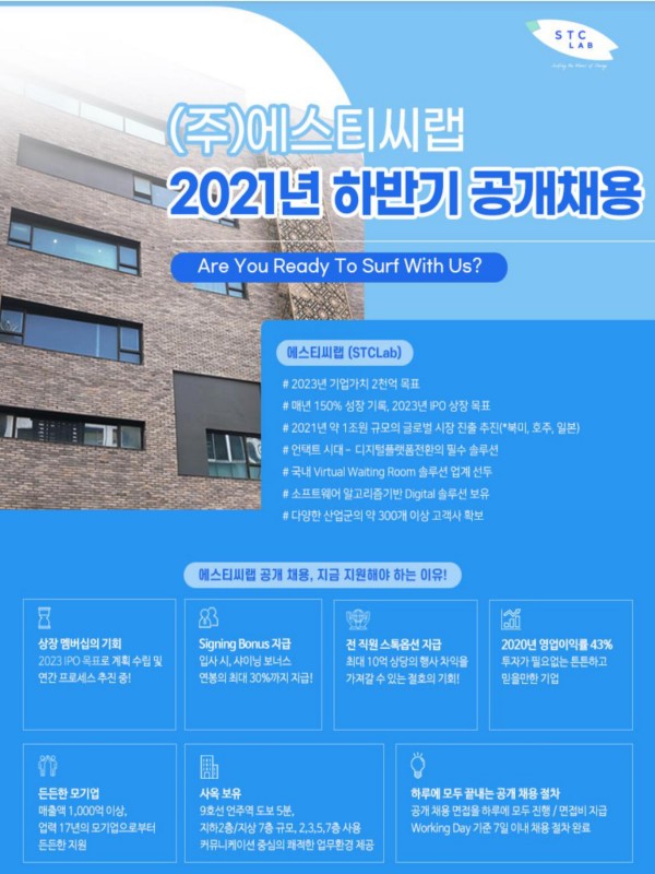 [에스티씨랩] 2021년 하반기 공채 페이지 정보 작성자 SW중심대학 댓글 0건 조회 1,267회 작성일 21-09-08 10:54 본문 첨부파일 20210401_STCLab_Company Introduction.pdf (4.6M) 130회 다운로드 | DATE : 2021-09-08 10:54:38 목록 이전글[초중고교 대상] AI(인공지능) 캠프 운영학교 모집 21.09.09 다음글[초중고생 대상] 2021년 2학기 온라인SW교육 신청 안내 21.09.08 댓글목록 댓글목록 등록된 댓글이 없습니다.