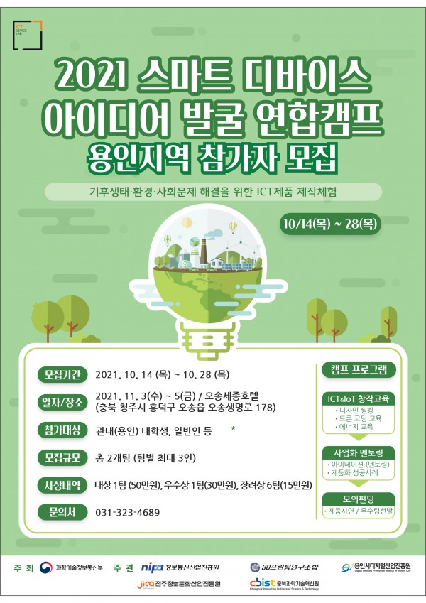 2021 스마트 디바이스 아이디어 발굴 연합캠프 페이지 정보 작성자 SW중심대학 댓글 0건 조회 1,393회 작성일 21-10-22 11:27 본문 첨부파일 붙임1 참가자 모집공고문.pdf (457.0K) 73회 다운로드 | DATE : 2021-10-22 11:27:09 붙임2 참가신청서 양식.hwp (58.5K) 69회 다운로드 | DATE : 2021-10-22 11:27:09 목록 이전글K-인공지능 제조데이터 분석 경진대회 21.11.03 다음글khuthon 2021 21.10.12 댓글목록 댓글목록 등록된 댓글이 없습니다.