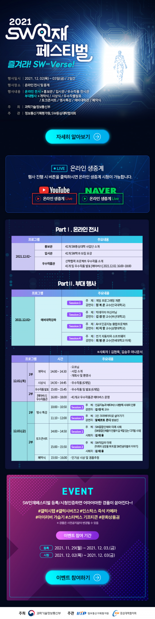 2021 SW인재페스티벌 페이지 정보 작성자 SW중심대학 댓글 0건 조회 1,240회 작성일 21-12-01 13:30 본문 :// o (행사 홈페이지) http://swfestival2021.kr/ 목록 이전글KHU TECH-CONCERT 21.12.01 다음글SW festival 안내 21.11.29 댓글목록 댓글목록 등록된 댓글이 없습니다.