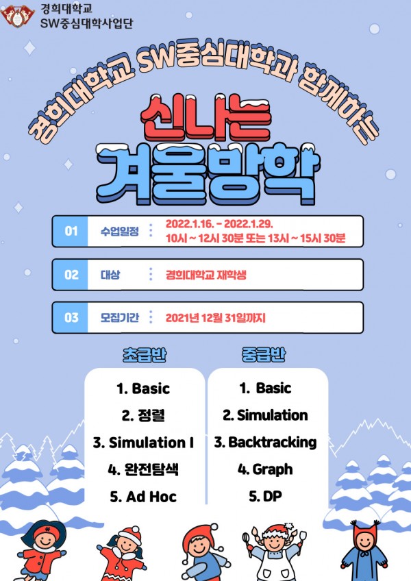 경희대학교 코딩테스트 대비 동계캠프 페이지 정보 작성자 SW중심대학 댓글 0건 조회 2,366회 작성일 21-12-15 13:13 본문 분반 날짜별 일정은 첨부한 강의 계획서 참고 바랍니다.강의 시간은 지원 내용에 따라 결정될 예정이며 지원자 수가 부족할 경우 합반 운영될수 있습니다.무단 불참 시 이후 SW중심대학 행사 참가에 불이익이 있을 수 있습니다.문의 : a01b01c01@khu.ac.kr지원 설문 링크주소와 QR 코드 입니다. 첨부파일 첨부1. 코드트리 코딩테스트 동계 방중 교육 ????????????.pdf (77.1K) 543회 다운로드 | DATE : 2021-12-15 13:17:09 목록 이전글2021- 동계 계절학기 수업도우미 모집 21.12.15 다음글주식회사 아이앤아이솔루션 인턴십 추가 선발 안내 21.12.09 댓글목록 댓글목록 등록된 댓글이 없습니다.