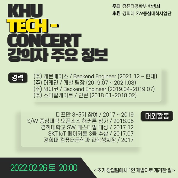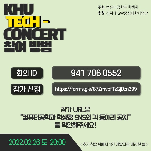 2022년 2월 KHU TECH-CONCERT 페이지 정보 작성자 SW중심대학 댓글 0건 조회 1,308회 작성일 22-02-21 08:57 본문 목록 이전글경희대학교 실감미디어 취창업을 위한 토크콘서트 안내 22.02.22 다음글2022 청년 디지털 취·창업, 연구, 창작 멘토링 청년 고민해결단 멘티 모집 22.02.17 댓글목록 댓글목록 등록된 댓글이 없습니다.