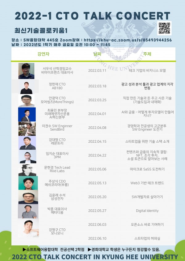 2022-1 CTO TALK CONCERT (최신기술콜로키움1) 개최 안내 페이지 정보 작성자 SW중심대학 댓글 0건 조회 1,245회 작성일 22-03-02 09:15 본문 ◈ 2022-1 CTO TALK CONCERT (최신기술콜로키움1) 개최 안내 ◈2022년도 최신기술콜로키움1 (부제: SW CTO Talk Concert) 과목에서는 다양한 현직에 계시는 산업체분들을 모셔서 학생들에게 실질적인 이야기와 현실적인 조언을 포함하여 강연을 진행합니다.날짜 : 2022년도 1학기 매주 금요일 오전 10:00 ~ 11:45 (이번 학기 강연은 실시간 비대면 수업입니다.)세부 강연일정은 첨부된 2022-1 CTO Talk Concert 홍보 포스터를 참고하시기 바라며 많은 참여 부탁드립니다. 목록 이전글2022년 1학기 SW수업도우미 모집 22.03.02 다음글경희대학교 실감미디어 취창업을 위한 토크콘서트 안내 22.02.22 댓글목록 댓글목록 등록된 댓글이 없습니다.