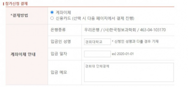 ▣ 아래의 그림과 같이 입금방법은 “계좌이체”를 선택하시고 입금메모에 “경희대 단체결재”라고 입력하시면 됩니다.