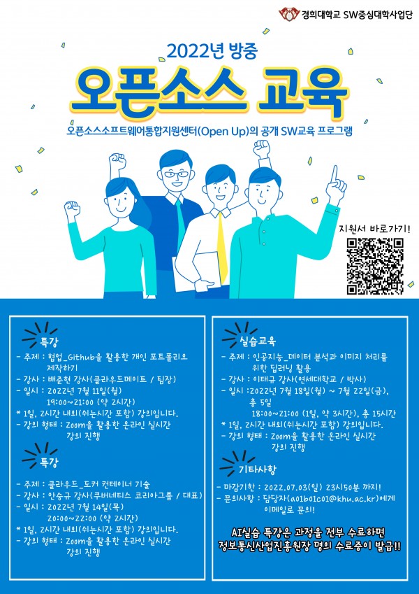 2022년 방중 오픈소스 교육 안내 페이지 정보 작성자 SW중심대학 댓글 0건 조회 1,919회 작성일 22-06-16 16:51 본문 관련링크 https://forms.gle/FcxFKWZ8LFvSW93K9 817회 연결 목록 이전글경희대학교 SW중심대학 포트폴리오 사이트 오픈 안내 22.06.16 다음글Samsung Open Source Companions(소프트웨어 인플루언서) 3기 모집안내 22.06.15 댓글목록 댓글목록 등록된 댓글이 없습니다.