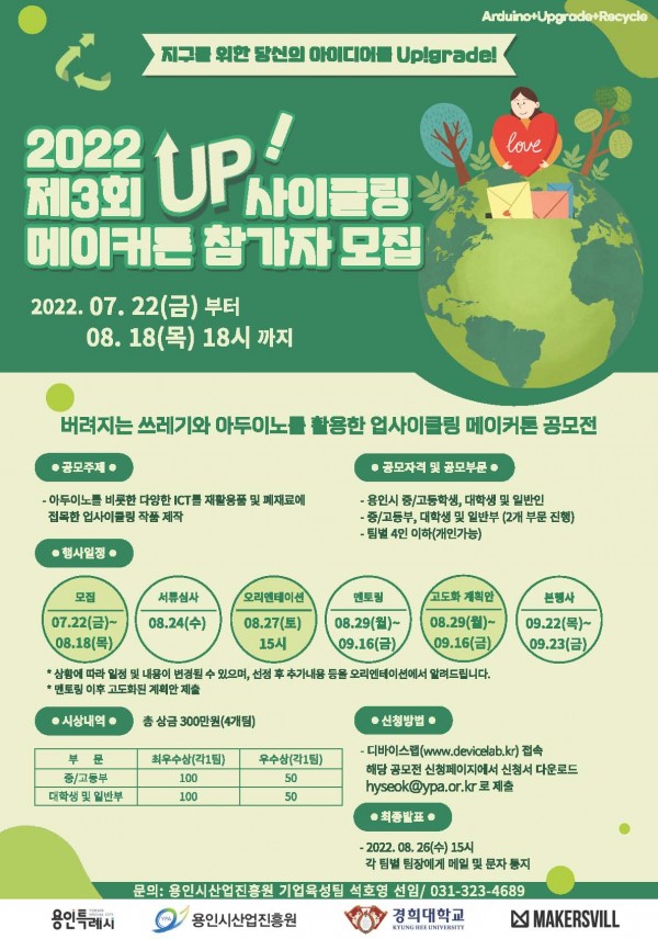 2022년 업사이클링 메이커톤 공모전을 경희대학교 SW중심대학사업단과 용인시산업진흥원이 공동 개최합니다.