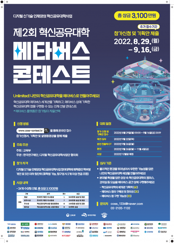 [실감미디어 사업단] 디지털혁신공유대학사업 메타버스 경진대회 개최 안내 페이지 정보 작성자 SW중심대학 댓글 0건 조회 716회 작성일 22-08-23 15:53 본문 [ 디지털 혁신공유대학사업 메타버스 콘테스트 개최]1. 참가신청 및 기획안 제출제출기한 : 2022.08.29(월) 00시00분 ~ 2022.09.16(금) 23시 59분까지2. 참가자격디지털 신기술 인재양성 혁신공유대학사업 참여대학에 재학중인 학부생 개인 및 5인이하팀 단위(휴학생 가능, 팀구성시 2개 이상 전공 조합)3. 신청방법해당 홈페이지를 통해 온라인 접수참가신청서, 기획안 및 설명동영상을 함께 제출자세한 사항은 홈페이지 참고 바랍니다. 관련링크 https://www.coss-contest.kr/ 529회 연결 목록 이전글2022년도 2학기 CTO TALK CONCERT (최신기술콜로키움2) 개최 안내 22.08.26 다음글2022년 8월 KHU TECH-CONCERT 22.08.23 댓글목록 댓글목록 등록된 댓글이 없습니다.
