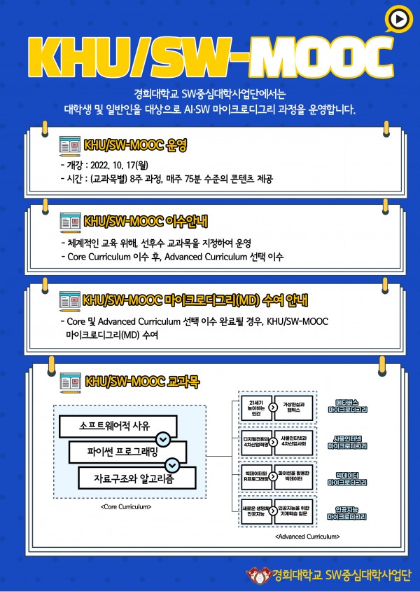 [대학생 및 일반인 대상] KHU/SW-MOOC 교육생 모집 페이지 정보 작성자 SW중심대학 댓글 0건 조회 1,204회 작성일 22-09-19 17:17 본문 아래 페이지를 누르면, 신청페이지로 연결됩니다.http://swedu.khu.ac.kr/bbs/board.php?bo_table=06_02 관련링크 http://swedu.khu.ac.kr/board5/bbs/board.php?bo_table=06_02 417회 연결 목록 이전글2022년 9월 KHU TECH-CONCERT 22.09.20 다음글제20회 2022년 가을 프로그래밍 경시대회 안내 22.09.15 댓글목록 댓글목록 등록된 댓글이 없습니다.