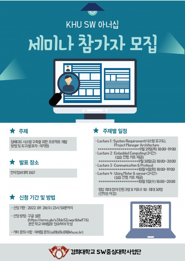 2022 KHU SW 아너십 세미나 참가 안내 페이지 정보 작성자 SW중심대학 댓글 0건 조회 855회 작성일 22-09-22 15:22 본문 관련링크 https://docs.google.com/forms/d/e/1FAIpQLSfcUiSR50udmwEhsyU6488Cb6Aseb… 799회 연결 목록 이전글SW중심대학 '소중人의 생활탐구' 영상 공모전 안내 22.09.29 다음글2022년 2학기 KHU SW 아너십 멘토링 안내 22.09.20 댓글목록 댓글목록 등록된 댓글이 없습니다.