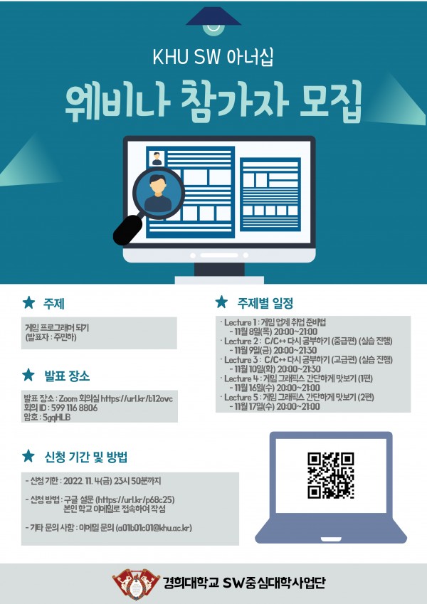2022년 KHU SW 아너십 웨비나 참가 안내 페이지 정보 작성자 SW중심대학 댓글 0건 조회 1,160회 작성일 22-10-27 16:07 본문 관련링크 https://docs.google.com/forms/d/e/1FAIpQLSdqPfBoiJozN6zp2vHgG9yILFdRxi… 465회 연결 목록 이전글2022 KHU SW페스티벌 안내 22.10.28 다음글(주)가치랩스 기업부설연구소 인턴십 및 파트타임 계약직 채용안내 22.10.21 댓글목록 댓글목록 등록된 댓글이 없습니다.