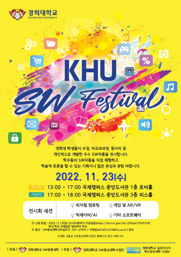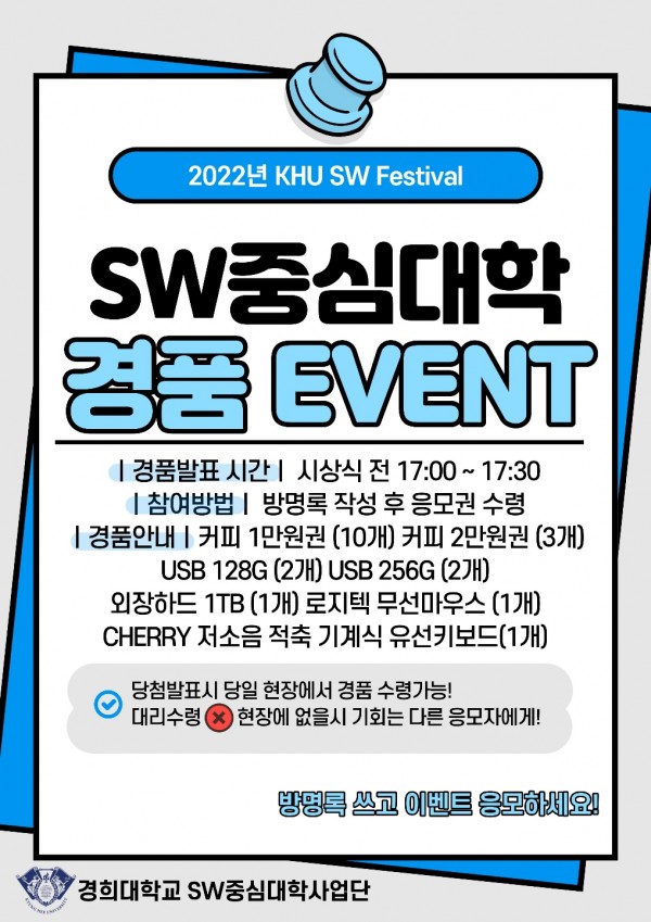 2022 KHU SW페스티벌 행사 경품 및 다과 증정 페이지 정보 작성자 SW중심대학 댓글 0건 조회 918회 작성일 22-11-21 14:56 본문 2022 KHU SW페스티벌 행사 경품 및 다과 증정 안내 2022. 11. 23 (수) 13:00 ~ 18:00 전시회 방문시 방명록 작성자에게 응모권 지급 경품 및 다과증정은 시상식 (오후 5시 , 중앙도서관 3층 피스홀)에서 진행 * 다양한 경품 및 푸짐한 다과(홍루이젠 샌드위치, 음료, 에너지바 등)가 준비되어 있으니, 많은 참여 바랍니다* 목록 이전글[LG AI연구원] LG Aimers 2기 모집 안내 22.11.23 다음글2022년 KHU 포트폴리오 공모전 22.11.14 댓글목록 댓글목록 등록된 댓글이 없습니다.