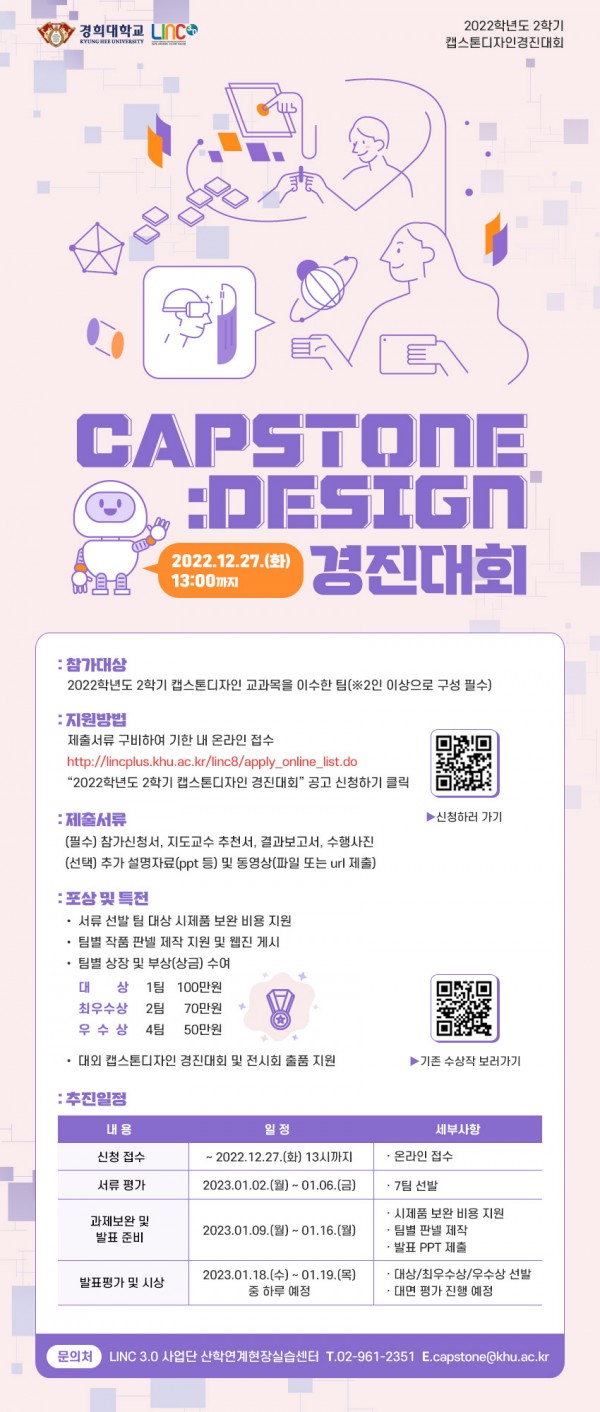 2022년 2학기 교내 캡스톤디자인 경진대회 안내 페이지 정보 작성자 SW중심대학 댓글 0건 조회 991회 작성일 22-12-19 13:40 본문 첨부파일 LINC 3.02022-2 캡스톤디자인 경진대회 서식.hwp (354.5K) 136회 다운로드 | DATE : 2022-12-19 13:40:53 관련링크 http://lincplus.khu.ac.kr/linc8/apply_online_list.do 526회 연결 목록 이전글SW중심대학 프로그램 일시 중단 안내 23.03.02 다음글AWS Cloud Bootcamp & Job Fair 안내 22.12.14 댓글목록 댓글목록 등록된 댓글이 없습니다.