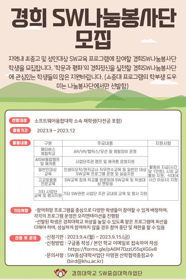 지역내 초중고 및 성인대상 SW교육 프로그램에 참여할 경희SW나눔봉사단 학생을 모집합니다. ‘학문과 평화’의 경희정신을 실천할 경희SW나눔봉사단에 관심있는 학생들의 많은 지원바랍니다. (소중대 프로그램의 학부생 도우미는 나눔봉사단에서만 선발함)