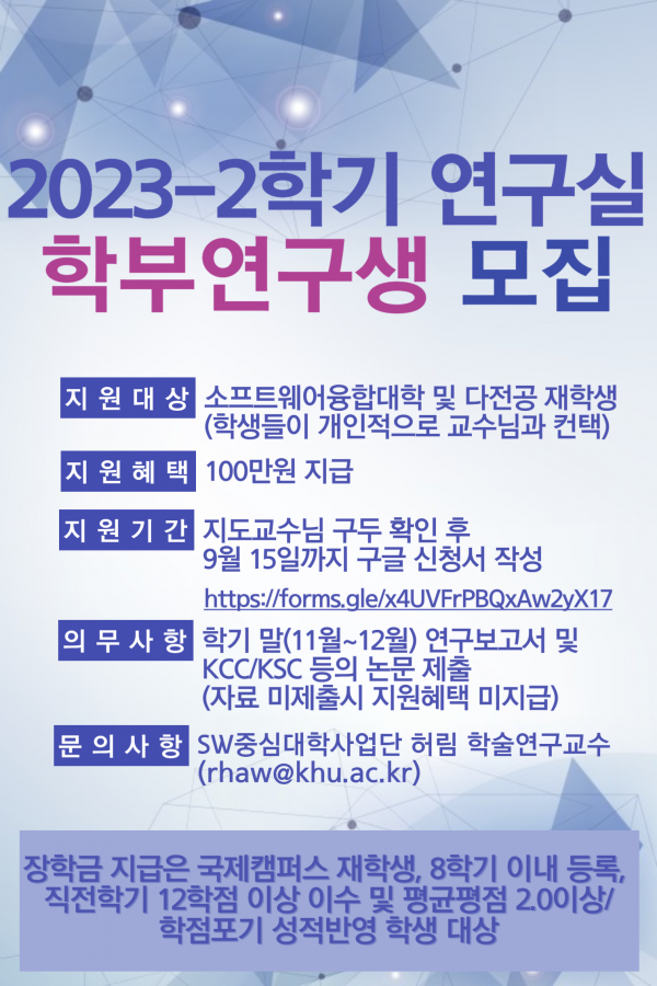 문의사항 : SW중심대학사업단 허림 학술연구교수(rhaw@khu.ac.kr)