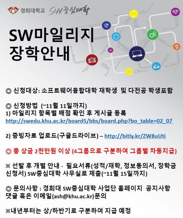 ◎ 문의사항 : 경희대 SW중심대학 사업단 홈페이지 공지사항 댓글 혹은 이메일(ash@khu.ac.kr)문의