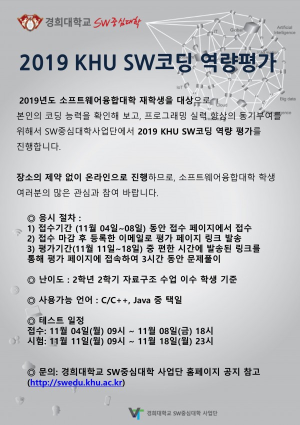 2019년도 소프트웨어융합대학 학생을 대상으로 본인의 코딩 능력을 확인해 보고, 프로그래밍 실력 향상의 동기부여를 할 수 있도록 경희대 SW중심대학 사업단에서 2019 KHU SW코딩 역량 평가를 진행합니다. 장소의 제약 없이 온라인으로 진행하므로 소프트웨어융합대학 학생 여러분의 많은 관심과 참여 바랍니다.?