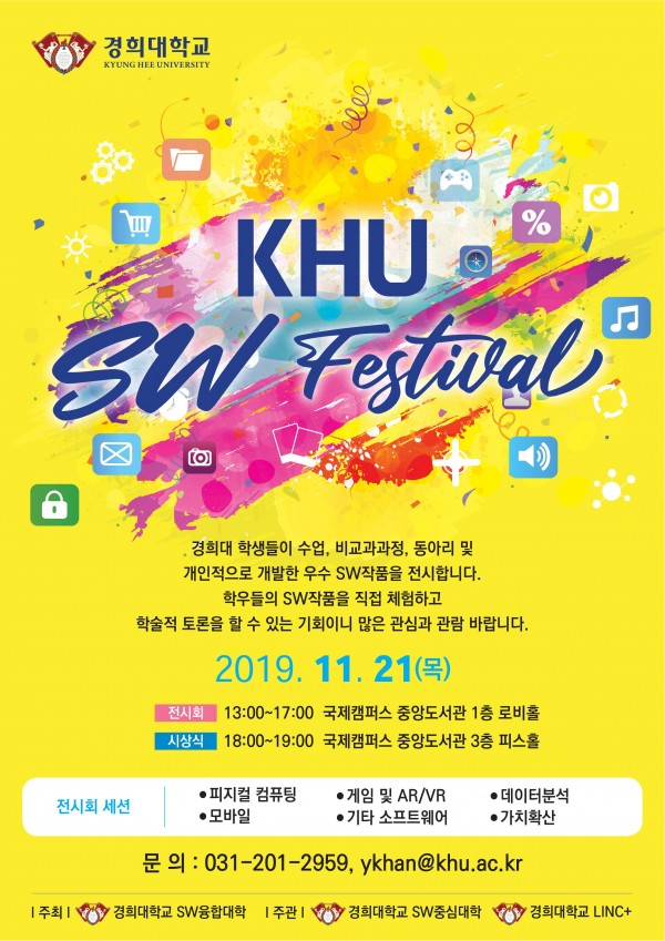 2019 SW페스티벌 행사 일정 안내 페이지 정보 작성자 SW중심대학 댓글 0건 조회 5,246회 작성일 19-11-08 11:52 본문 경희대 학생들이 수업, 비교과과정, 동아리 및 개인적으로 개발한 우수 SW작품을 전시합니다.학우들의 SW 작품을 직접 체험하고 학술적 토론을 할 수 있는 기회이니,많은 관심과 관람 바랍니다.전시회 일시: 2019년 11월 21일 (목) 13:00 ~ 17:00전시회 장소: 국제캠퍼스 중앙도서관 1층 로비홀자세한 사항은 행사 참가 안내 포스터를 참조바랍니다. 목록 이전글'20 NHN Entertainment 체험형 인턴십 19.11.11 다음글[특강]기술로 꿈을 꾸다-'실리콘밸리에서 바라본 AI & Future Technology' 19.11.08 댓글목록 댓글목록 등록된 댓글이 없습니다.
