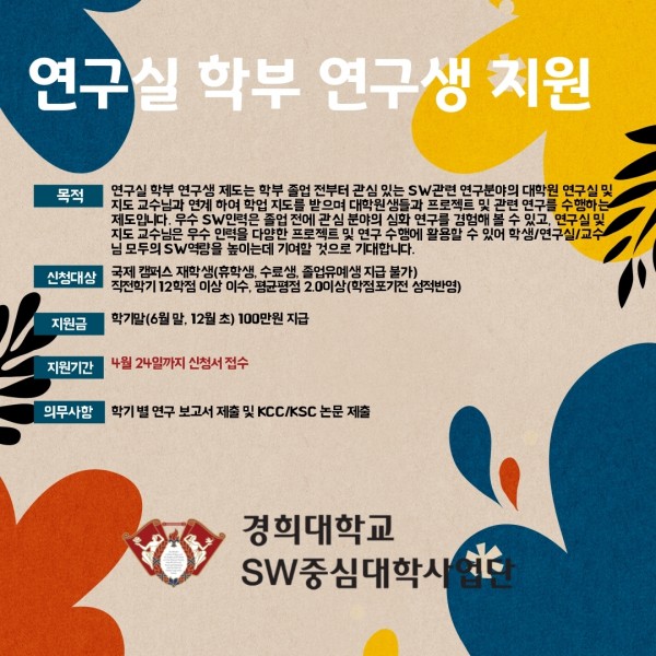 연구실 학부 연구생 지원(4월 30일까지 기간연장)