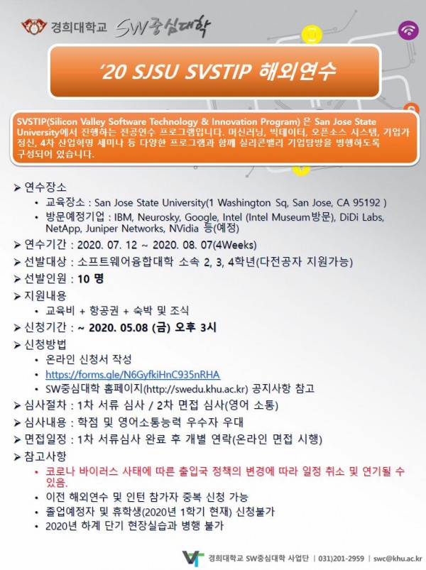 '20 SJSU SVSTIP 해외연수 페이지 정보 작성자 SW중심대학 댓글 0건 조회 3,263회 작성일 20-04-27 13:42 본문 목록 이전글'20 하반기 실리콘밸리 해외인턴십 20.04.27 다음글SW수업 도우미 제도 대상 교과목 확대(4월 30일까지 기간연장) 20.04.13 댓글목록 댓글목록 등록된 댓글이 없습니다.