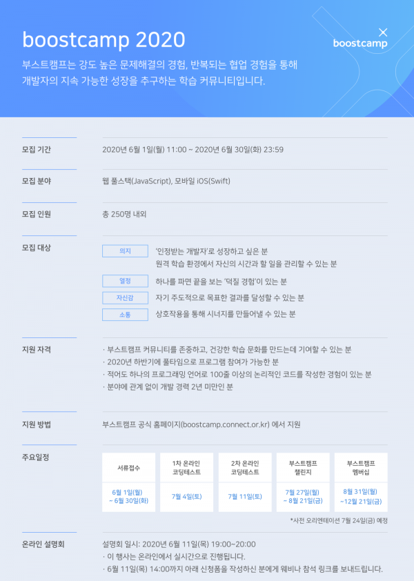 부스트캠프 2020 설명회에 여러분을 초대합니다.