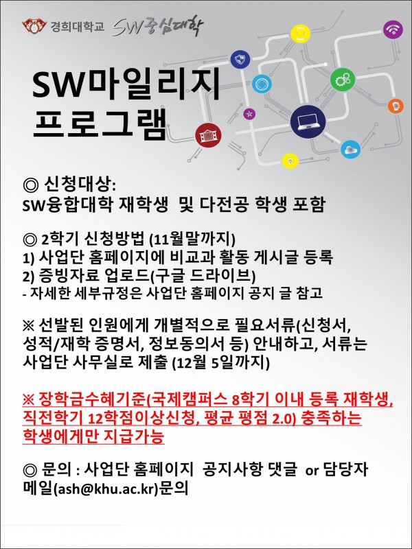 경희대학교 SW중심대학사업단과 소프트웨어융합대학에서는 매년 정규 교과과정 이외에 다양한 전공관련 비교과과정 프로그램을 운영하고 있습니다.