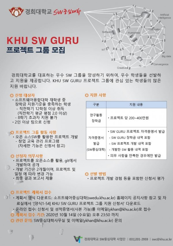 경희대학교를 대표하는 우수 SW 그룹을 양성하기 위하여, 우수 학생들을 선발하고 지원을 제공합니다. KHU SW GURU 프로젝트 그룹에 관심 있는 학생들의 많은 지원 바랍니다.