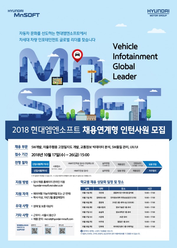 2018년 현대엠엔소프트 채용연계형 인턴사원 모집 페이지 정보 작성자 SW중심대학 댓글 0건 조회 4,375회 작성일 18-10-17 10:21 본문 2018 현대엠엔소프트 채용연계형 인턴사원 모집합니다일시 : 10월 17일(수) ~ 26일(금) 15:00지원 자격 : 학사 이상, 19년 2월 졸업예정자 만 가능관심있는 학생들은 아래의 첨부파일을 참고하여 지원하기 바랍니다.참고로, 2018년 겨울방학 1개월 현장실습과 연계가 가능합니다.여러분의 많은 참여 기대합니다. 목록 이전글인도네시아 디지털노마드 스타트업 육성 프로그램 선발공고 18.10.18 다음글2019년 PeopleSpace 해외 교육 및 인턴십 선발 공고 18.10.17 댓글목록 댓글목록 등록된 댓글이 없습니다.