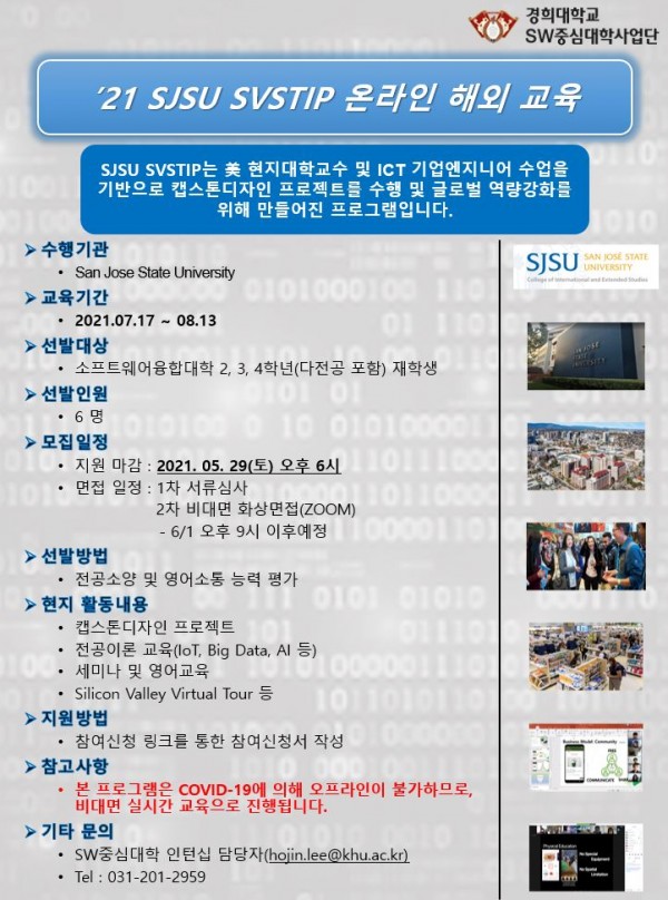 ’21 SJSU SVSTIP 온라인 해외 교육 페이지 정보 작성자 SW중심대학 댓글 0건 조회 2,294회 작성일 21-05-26 15:33 본문 <<프로그램 안내사항>>* Computer Science 관련 과목을 중심으로 다양한 주제의 수업이 진행되므로, 2~4학년 모든 학생 지원 가능* 기본적인 영어소통능력 가능할 경우 지원 가능(한국어 가능 현지 교수 및 관리자 지원)* IoT, Big Data, AI 관련 다양한 수업을 체험하기를 희망하는 학생 지원 요망 첨부파일 첨부.SJSU 온라인 해외교육 계획안.pdf (558.5K) 197회 다운로드 | DATE : 2021-05-26 15:35:35 목록 이전글‘21 UCI GREAT 온라인 해외 교육 21.05.26 다음글실리콘밸리 해외 인턴십(국내지사) 모집 21.05.26 댓글목록 댓글목록 등록된 댓글이 없습니다.