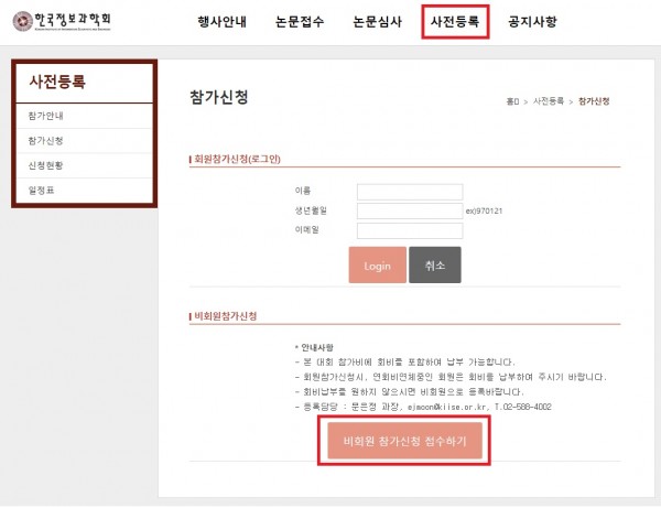 사전등록 - 비회원참가신청- 등록자정보 입력 - 사전등록 참가비만 지원(유로워크샵 지원 안됨)