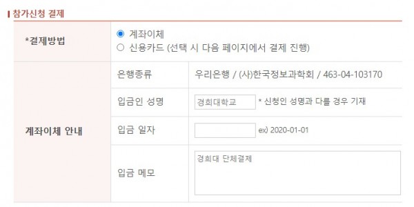 그래서 아래 그림과 같이 입금방법은 “계좌이체”를 선택하시고 입금메모에 “경희대 단체결재”라고 입력하시면 됩니다.