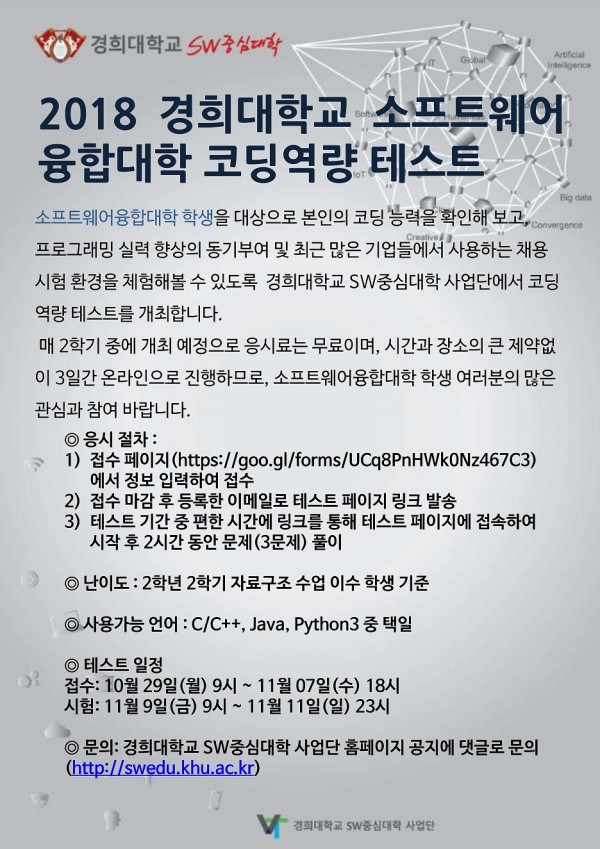 [안내] 2018 경희대학교 소프트웨어융합대학 코딩역량 테스트 기간연장 안내