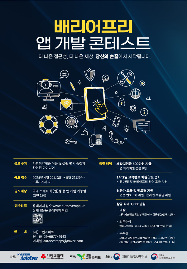 현대오토에버와 서울사회복지공동모금회의 지원, 사단법인 그린라이트 주관, 과학기술정보통신부와 교육부 국립특수교육원이 후원하는 「배리어프리 앱 개발 콘테스트」는 대학(원)생들이 사회취약계층의 이동 및 생활 편의 증진 앱을 개발하여 보급하는 사회공헌사업입니다. 누구나 접근 가능한 앱을 제작하고 보급하여 사회취약계층의 물리적, 사회적 차별을 해소하는데 기여하는 「배리어프리 앱 개발 콘테스트」를 다음과 같이 공고하오니 역량 있는 학생들의 적극적인 참여 부탁드립니다.