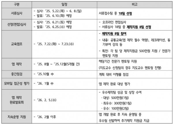 - 콘테스트 전체 과정 (심사, 교육캠프, 중간점검, 완료발표회) 필수 참석