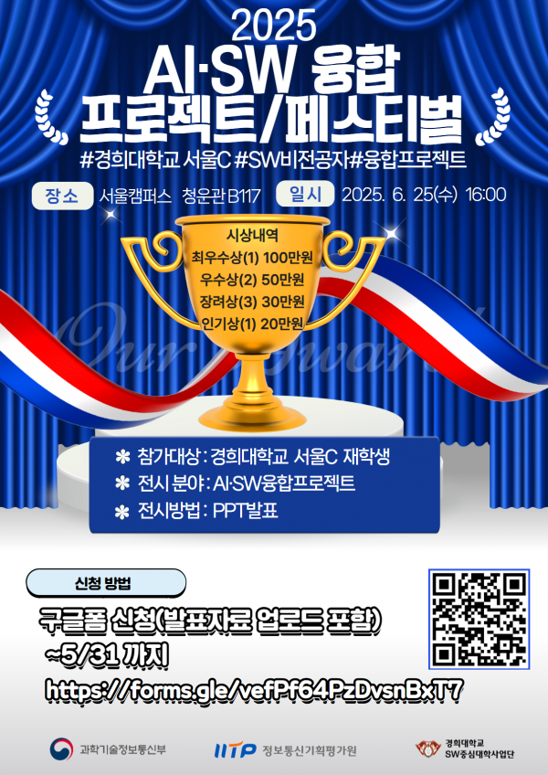 경희대학교 SW중심대학사업단에서는 아래와 같이 AI·SW 융합 프로젝트 및 페스티벌을 진행하고자 하오니 관심있는 학생분들의 많은 신청 바랍니다.