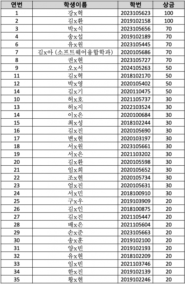몇몇 학생은 학기초과 및 휴학생이라 장학대상이 아니므로 제외되었습니다.