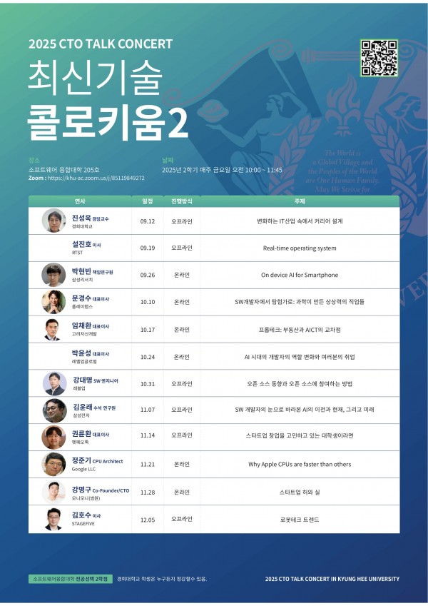 2025년도 2학기 CTO TALK CONCERT (최신기술콜로키움2) 안내 페이지 정보 작성자 SW중심대학 댓글 0건 조회 290회 작성일 25-09-16 15:26 본문 2025년도 최신기술콜로키움2 (부제: SW CTO Talk Concert) 과목에서는 다양한 현직에 계시는 산업체분들을 모셔서 학생들에게 실질적인 이야기와 현실적인 조언을 포함하여 강연을 진행합니다.날짜 : 2025년도 2학기 매주 금요일 오전 10:00 ~ 11:45 세부 강연일정은 첨부된 2025-2 CTO Talk Concert 홍보 포스터를 참고하시기 바라며 많은 참여 부탁드립니다. 목록 이전글[홍보] 2025 SW중심대학사업 공동 SW산업세미나_2차 (신청 : ~9/28) 25.09.23 다음글[홍보] [한양대 ERICA] 2025 전국 대학생 SW창업 아이디어톤 25.09.16 댓글목록 댓글목록 등록된 댓글이 없습니다.