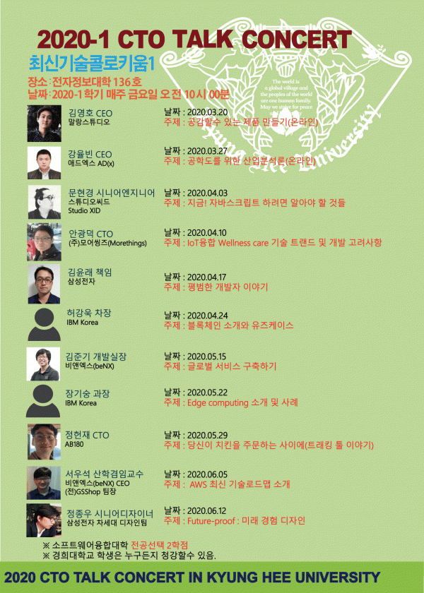 2020-1 CTO TALK CONCERT (최신기술콜로키움1) 개최 페이지 정보 작성자 SW중심대학 댓글 0건 조회 2,723회 작성일 20-03-09 15:39 본문 2020년도 최신기술콜로키움1 (부제: SW CTO Talk Concert) 과목에서는 다양한 현직에 계시는 CTO분들을 모셔서 학생들에게 실질적인 이야기와 현실적인 조언을 포함하여 강연을 진행한다.?이번 학기 강연은 실시간 비대면 수업으로 금요일 오전 10시부터 진행된다. 세부 강연일정은 아래의 첨부된 2020-1 CTO Talk Concert 홍보 포스터를 참고할 수 있다. ? 목록 이전글SW학업장려(여름방학) 선발 안내 20.10.08 다음글2020-2학기 SW수업도우미 선발 안내 20.09.24 댓글목록 댓글목록 등록된 댓글이 없습니다.