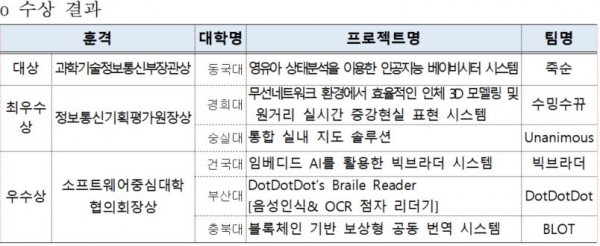 2019 SW인재페스티벌(SW중심대학관) - 최우수상 수상 페이지 정보 작성자 SW중심대학 댓글 0건 조회 2,499회 작성일 19-12-05 10:58 본문 경희대학교 SW중심대학사업단은 SW산업 중요성 전달 및 SW교육에 대한 국민적 신뢰·지지기반 확보를 통해 전 국민적 SW가치 인식 제고하기 위하여 12월 4일부터 5일까지 2일간 세종대학교 광개토관 컨벤션홀에 참여하였다. 이 날 SW중심대학 산학협력프로젝트(캡스톤디자인 등)를 통해 도출된 우수성과물 전시하였으며 우수 성과물에 대해서는 투표를 통하여 과기정통부 장관상이 수여 될 예정이다. 목록 이전글SW가치확산 - 엔트리프로그래밍(오프라인교육) 19.12.10 다음글찾아가는 SW체험학교(청명유치원) 19.12.05 댓글목록 댓글목록 등록된 댓글이 없습니다.