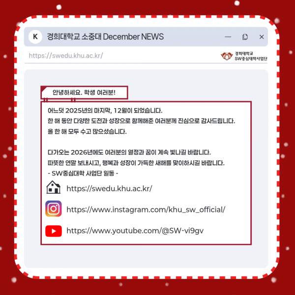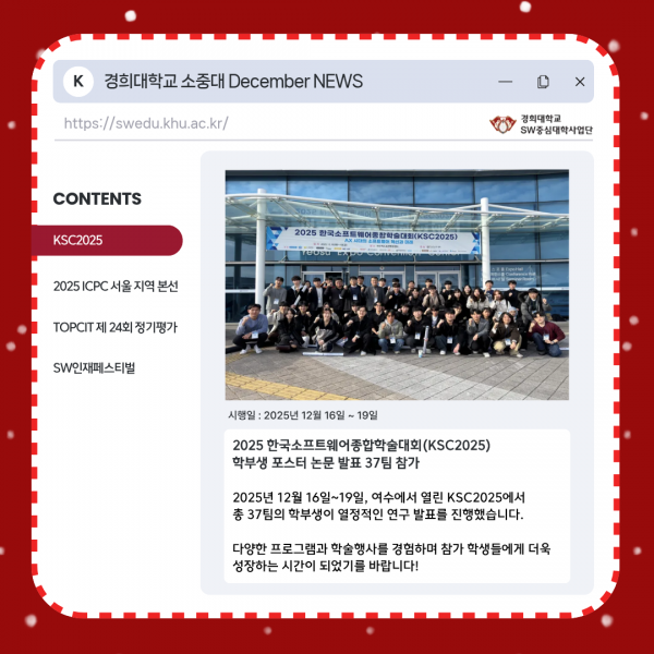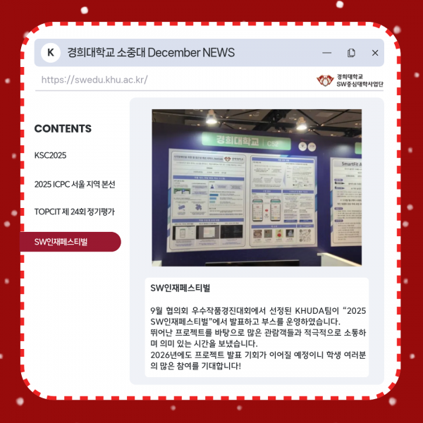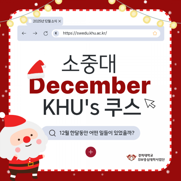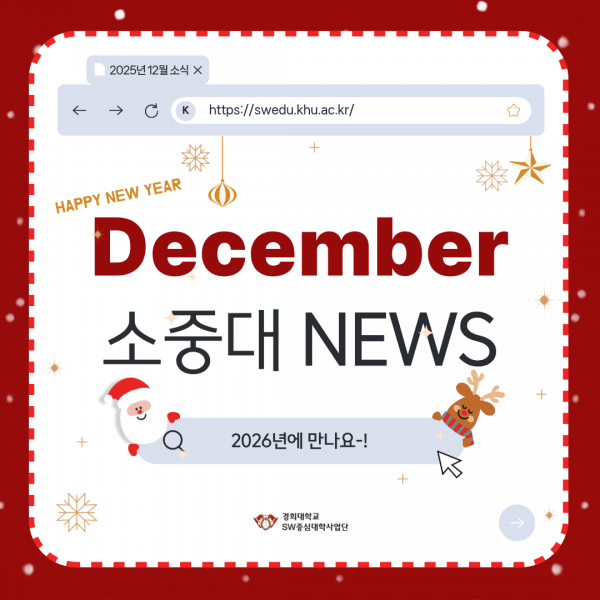 [KHU's 쿠스] 2025년 12월 SW중심대학사업단 뉴스 페이지 정보 작성자 SW중심대학 댓글 0건 조회 168회 작성일 25-12-30 15:25 본문 목록 다음글[KHU's 쿠스] 2025년 11월 SW중심대학사업단 뉴스 25.12.02 댓글목록 댓글목록 등록된 댓글이 없습니다.
