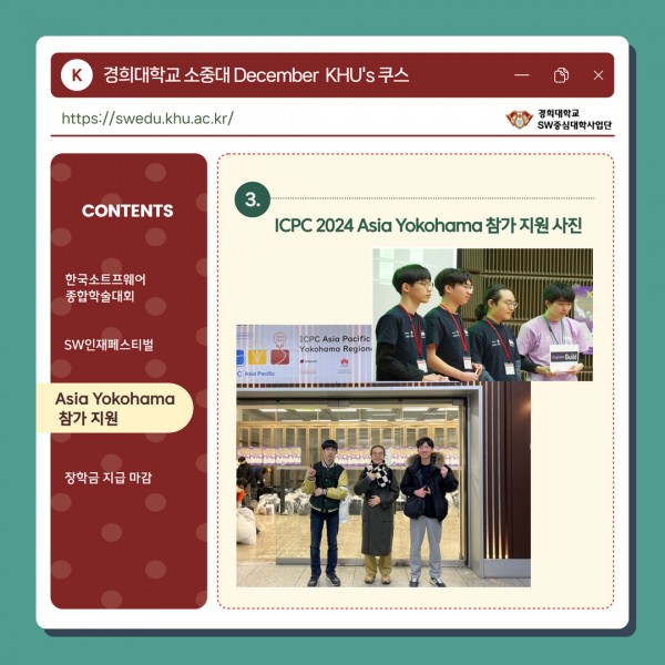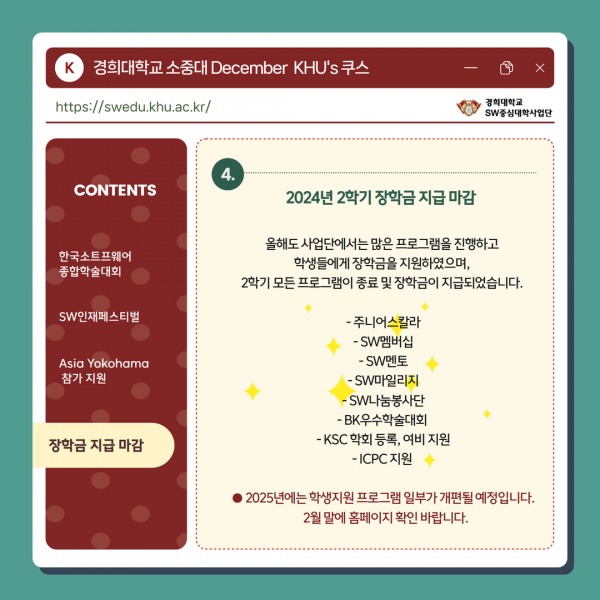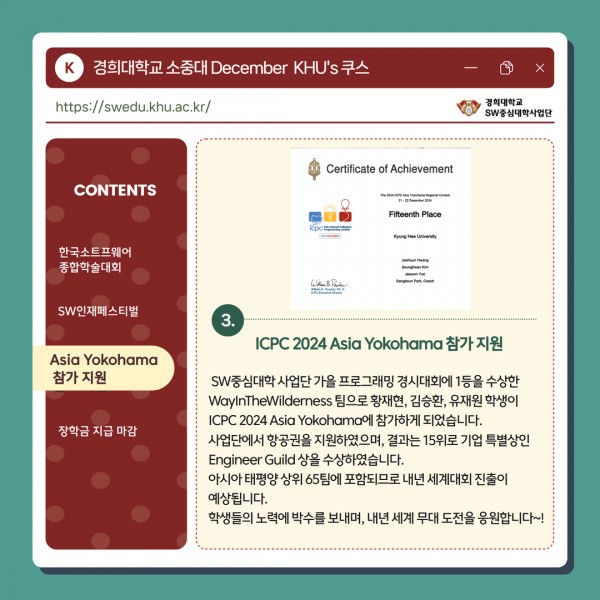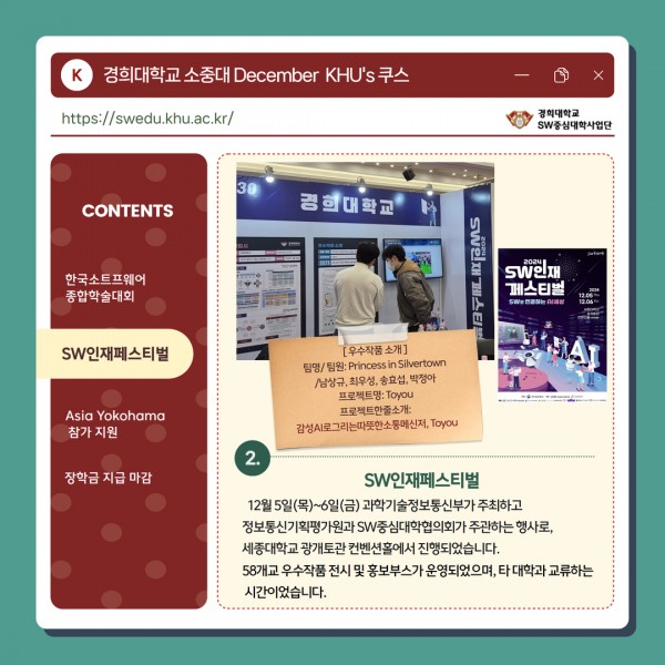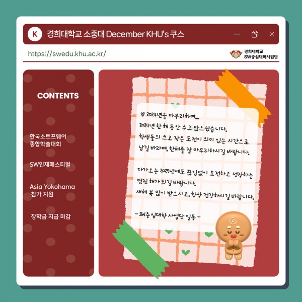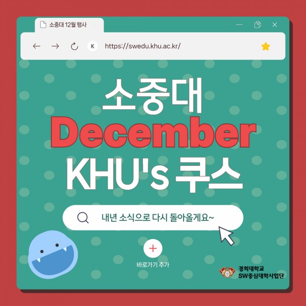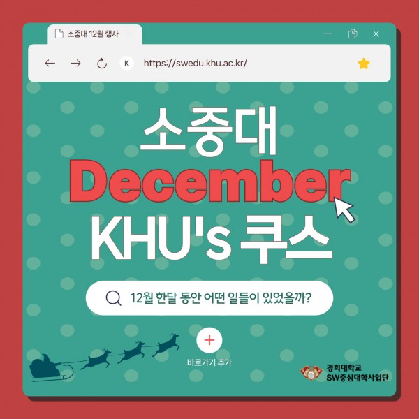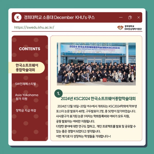 [KHU's 쿠스] 2024년 12월 SW중심대학사업단 뉴스 페이지 정보 작성자 SW중심대학 댓글 0건 조회 458회 작성일 24-12-31 14:54 본문 목록 이전글2025-1학기 KHU SW 멘토 선정 공지 25.03.17 다음글[KHU's 쿠스] 2024년 11월 SW중심대학사업단 뉴스 24.12.31 댓글목록 댓글목록 등록된 댓글이 없습니다.