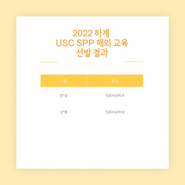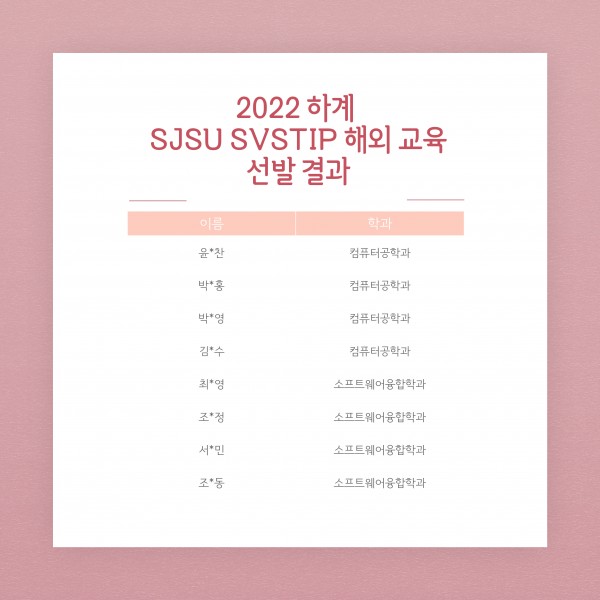 2022년 하계 해외교육(USC SPP, SJSU SVSTIP) 선발 결과 안내 페이지 정보 작성자 SW중심대학 댓글 0건 조회 1,281회 작성일 22-04-27 14:20 본문 2022년 하계 해외교육 최종 선발이 완료되어 다음과 같이 안내드립니다. 목록 이전글2022 하반기 실리콘밸리 인턴십 선발 결과 안내 22.05.12 다음글NHN 인턴십 최종결과 21.12.31 댓글목록 댓글목록 등록된 댓글이 없습니다.